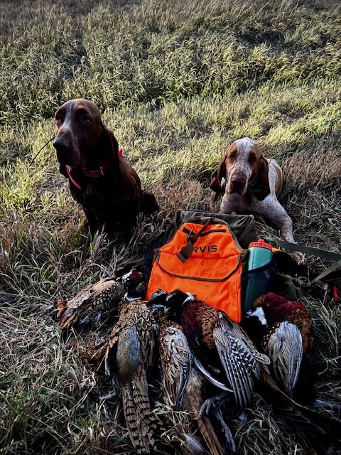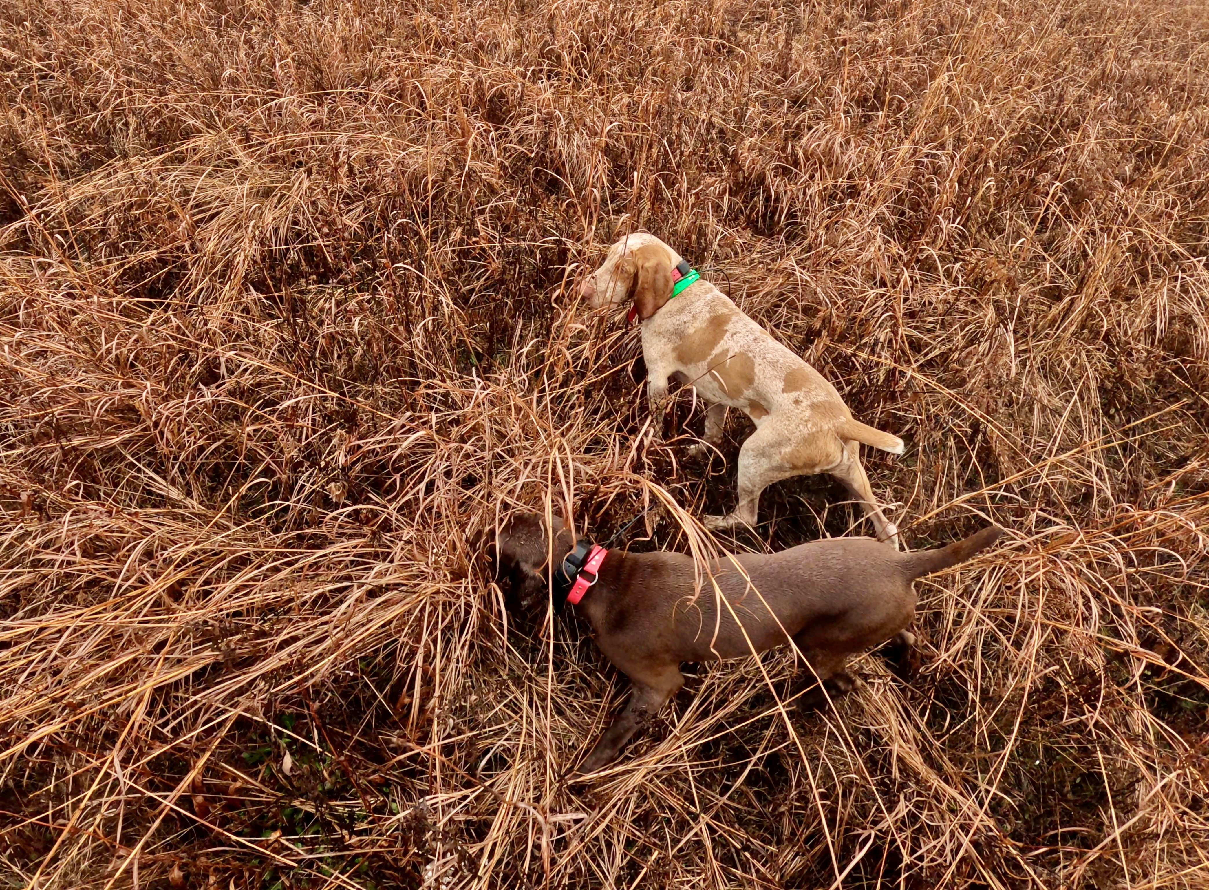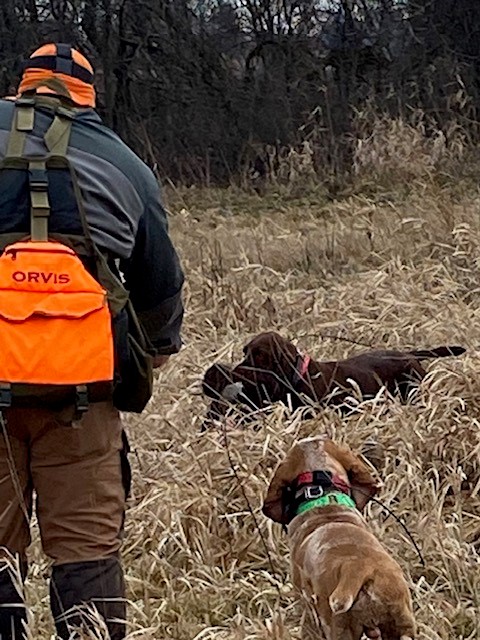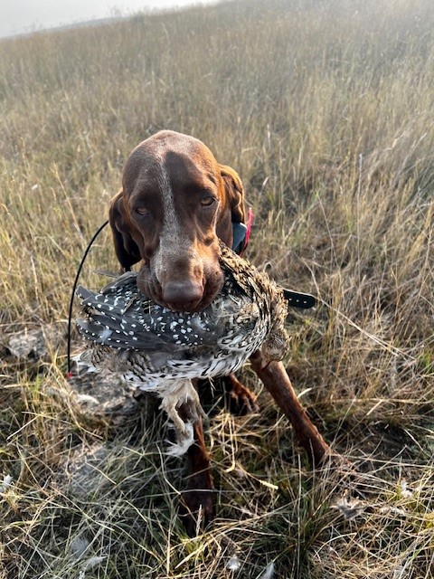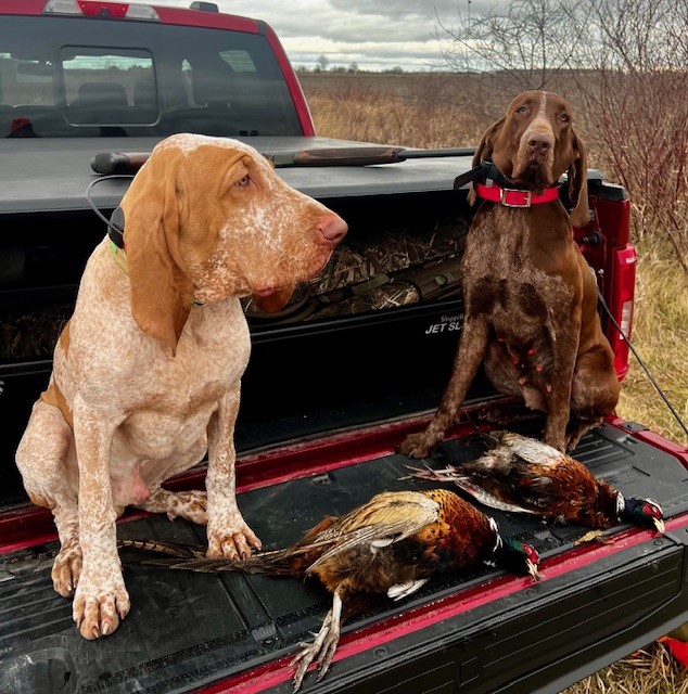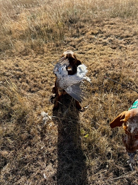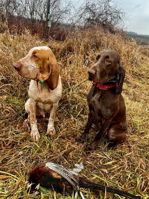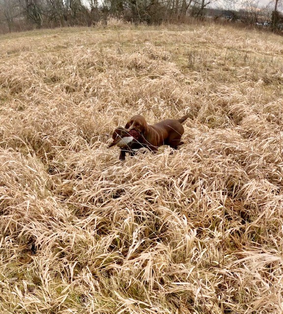 Enzo came to us from DI Witingove Kennels in the Czech Republic. His pedigree has a long line of dogs from renowned Italian kennel, di Cascina Croce. This Kennel is known for putting out some very high-quality hunting Bracco Italianos. Enzo has remarkable prey drive, determination and high intelligence. Training with Bracco’s can be very difficult at times due to their soft nature and being prone to getting their feelings hurt. However, Enzo has been very easy to train and picks things up remarkably quick. In the field he is laser focused and will cover a lot of ground. Enzo likes to work close and is always checking where I am in the field to make sure he is nearby. He has one of the best noses I have ever seen. This past year he was able to go out west hunting and he did spectacular on sharptailed grouse and pheasants in South Dakota. Enzo has a lot of strong retrieving abilities as well and is looking forward to doing some force fetch training with him this summer. Enzo has a very calm demeanor and listens extremely well. It is very rare that he ever requires hearing a command more than once. Enzo is a large dog, weighing about 85lbs and still considers himself a lap dog. He is full of personality and enjoys hunting our 50 acres for anything that moves. One of his favorite pastime activities is mousing in our CRP field. Watching him hunt for mice is very comical, and he even pounces on them like a cat would. On Average he usually catch’s 1-2 mice a week and brings them up to the house just like a cat would. Squirrels are his second passion on our property. This past winter he even managed to finally catch 2 of them. When the weather warms up, I purchase a lot of quail and put them in my recall pen. Enzo and Mia both get lots of work with the quail throughout the summer to help prime them up for fall hunting season.