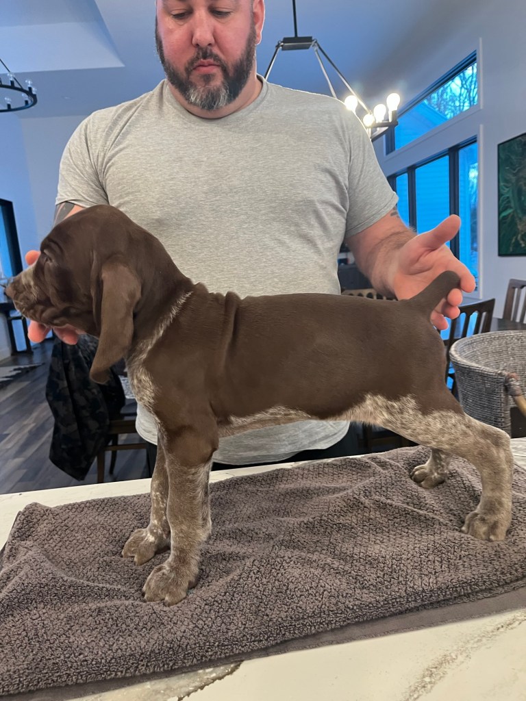 From the very first contact, we have been nothing but impressed with Zach and Kelly. Although it was their first litter of Bracchi, they were extremely knowledgeable about the breed, and what they want the future of their breeding program to look like. They did their research in selecting a sire for this first litter, and were responsible in making sure both the Dam and Sire passed all health testing before considering breeding. The Harris’ are dedicated to breeding for health, temperament, and field performance. Bottom line is they love this breed, and it shows. Couldn’t ask for anything more!